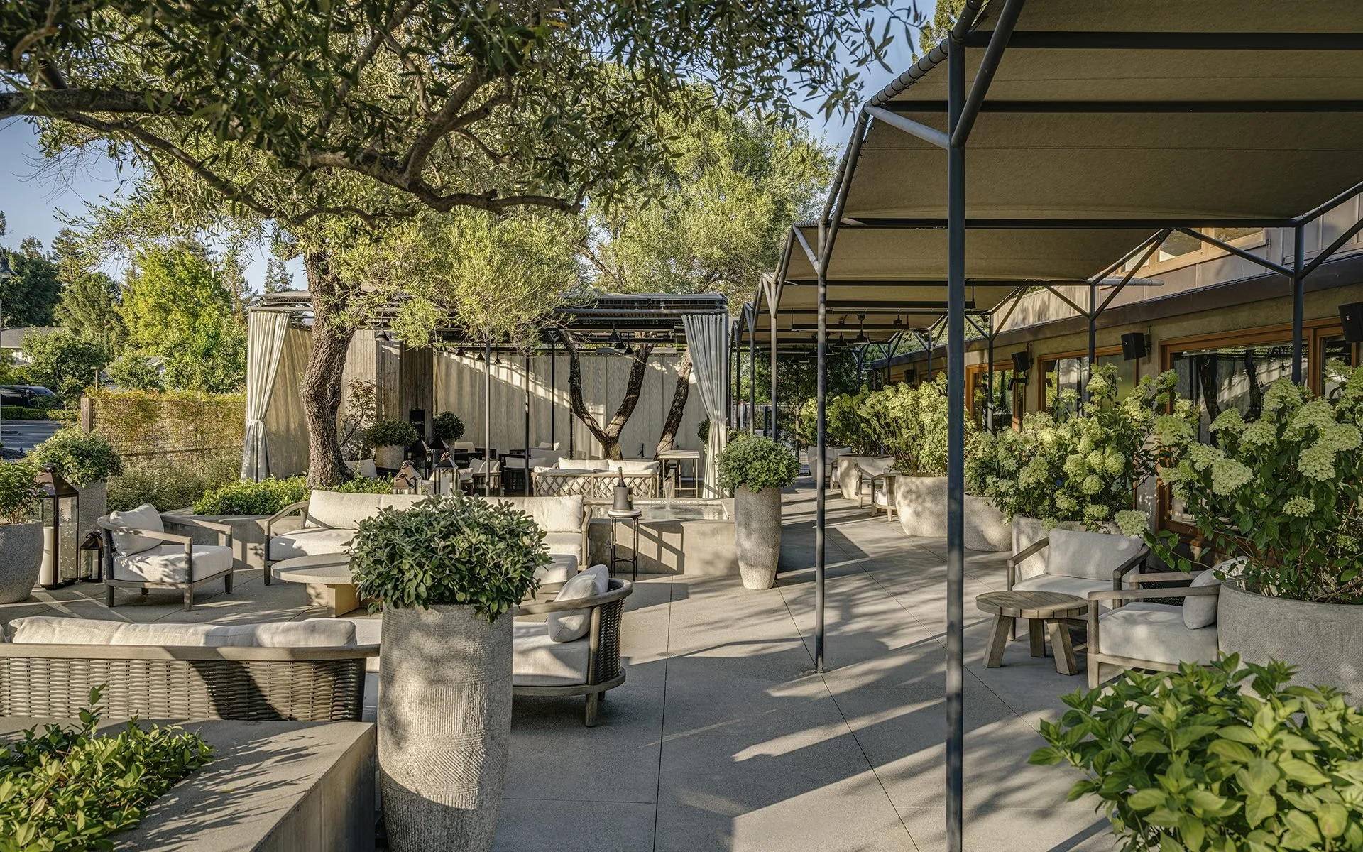 The space was designed with a curated assortment of RH furnishings where exquisite dishes are presented in a lush garden setting or within a series of elegant lounge spaces in a palette of deep sea greens, organic textures and luxe seating. Live music jazz and the Mediterranean-like climate of Napa Valley make this an experience for all your senses.